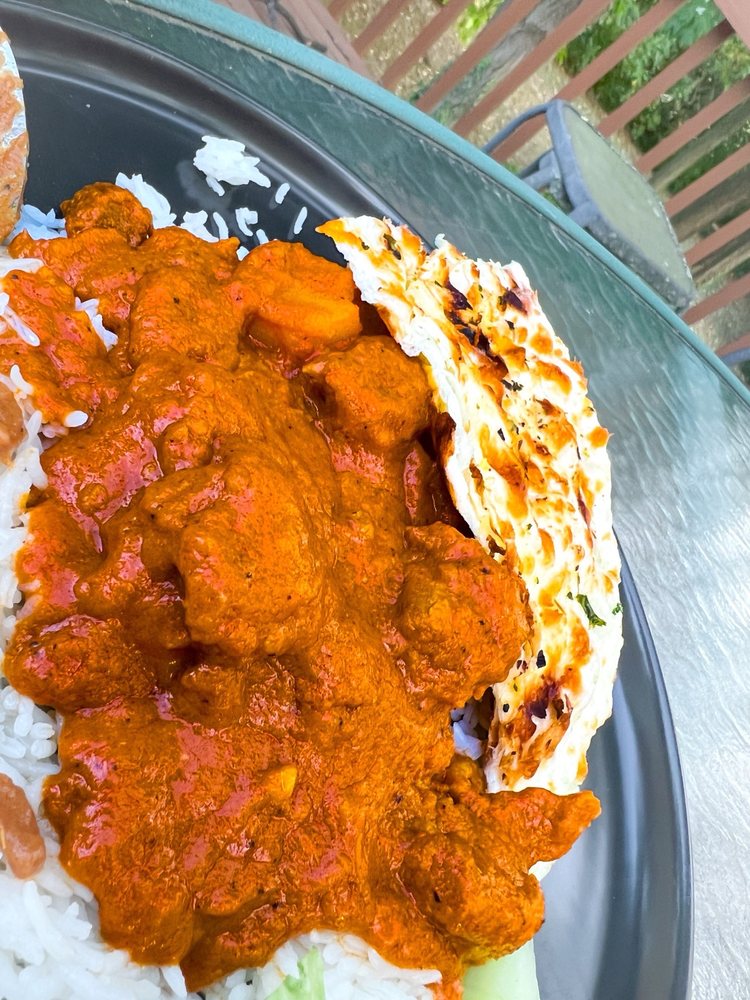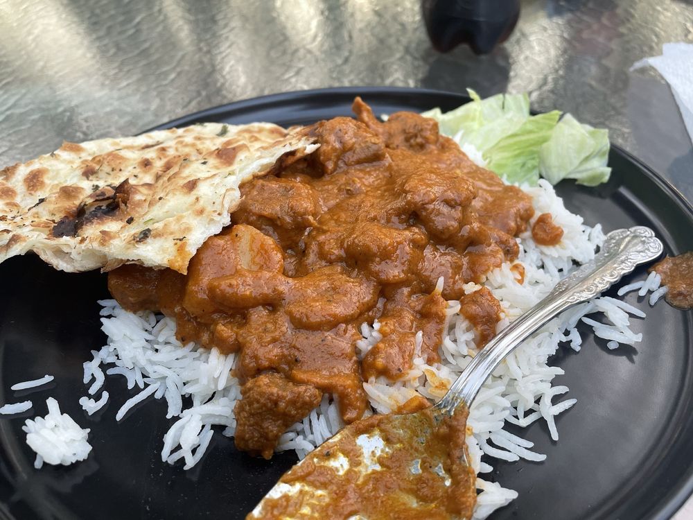 Goat meat with bones, cooked with spices and served with one naan and rice.